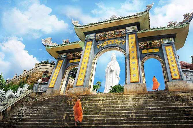 Linh Ung Pagoda is situated on Son Tra Peninsula, 639 meters above the sea level and 10 kilometers away from the center of Da Nang city to the Northeast. The pagoda faces the peninsula, overlooking the East Sea. There is Cu Lao Cham Island to the left of the pagoda and a spectacular view of Hai Van Mountain to the right. The most prominent feature of Linh Ung