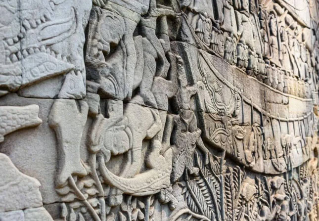bas-relief in the world, which runs along the outer gallery walls and narrates stories from Hindu mythology.